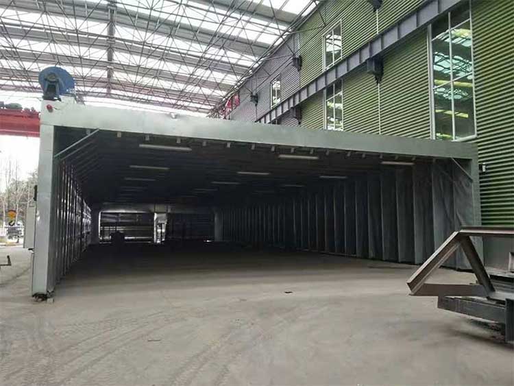 ,因為鋼管的工件比較長,為了方便工件的運轉,提高生產(chǎn)效率,以及有效的收集漆霧顆粒,故需要一臺長24米,寬6米,高4米的移動伸縮噴漆房移動噴漆房框架使用鍍鋅方管制作,移動伸縮房蓬布使用三防布制作,內(nèi)部設有防爆炸照明裝置,佑泰環(huán)保制作的移動伸縮噴漆房,使用機器人焊接,安裝后外觀美麗大方,結實耐用。