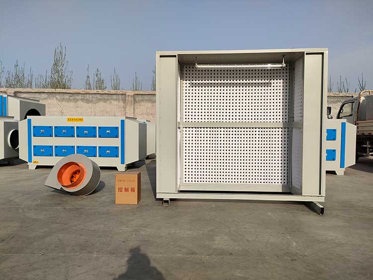 環(huán)保干式噴漆柜,用折流式過(guò)濾紙、玻纖過(guò)濾棉相結(jié)合方法,可有效吸收超范圍的噴涂漆霧。過(guò)噴氣流先經(jīng)過(guò)折流紙,使氣流多次改動(dòng)流動(dòng)方向,這樣那些比空氣重的顆粒會(huì)粘附在折流板壁上,不會(huì)隨氣流而帶走,部分細(xì)微顆粒經(jīng)過(guò)纖維過(guò)濾棉進(jìn)行二次過(guò)濾,漆霧凈化作用高達(dá)98%以上。去除漆霧的有機(jī)氣體再經(jīng)過(guò)活性炭吸附箱或光氧催化設(shè)備凈化后高空排放。