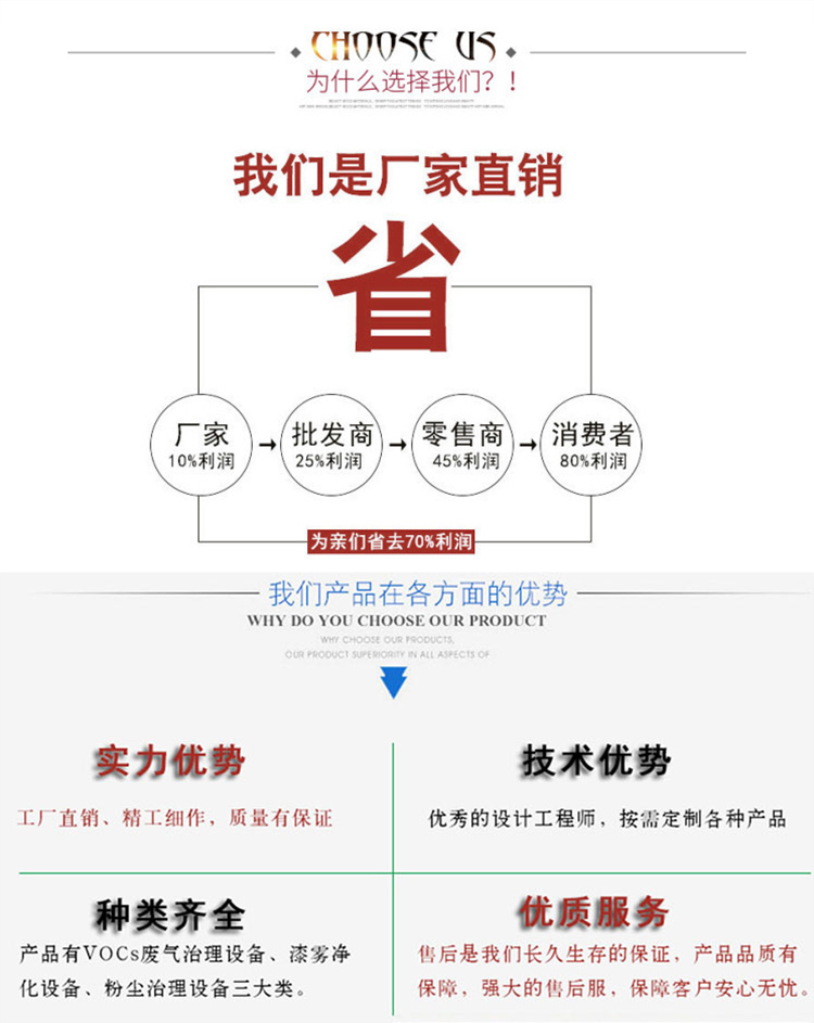 公司的環(huán)保設(shè)備有VOCs廢氣處理設(shè)備、工業(yè)粉塵處理設(shè)備兩大類(lèi)。廢氣治理環(huán)保設(shè)備有催化燃燒設(shè)備pp噴淋塔、活性炭吸附箱移動(dòng)伸縮噴漆房、氣旋塔、水簾噴漆柜漆水分離一體機(jī)等環(huán)保設(shè)備。粉塵處理設(shè)備包括濾筒式脈沖除塵器、布袋除塵器打磨吸塵工作臺(tái)、水簾式打磨臺(tái)等設(shè)備。我們可以根據(jù)企業(yè)的實(shí)際情況定制合適的環(huán)保設(shè)備。歡迎您來(lái)電咨詢(xún)15665879292,或者添加網(wǎng)頁(yè)下面微信,把您的廢氣治理需求告訴我們,我們?yōu)槟峁┰O(shè)備的詳細(xì)參數(shù)、配置及價(jià)格,為你提供相關(guān)設(shè)備的案例圖片或視頻,同時(shí)可以給您發(fā)公司車(chē)間正在加工設(shè)備的視頻或圖片。