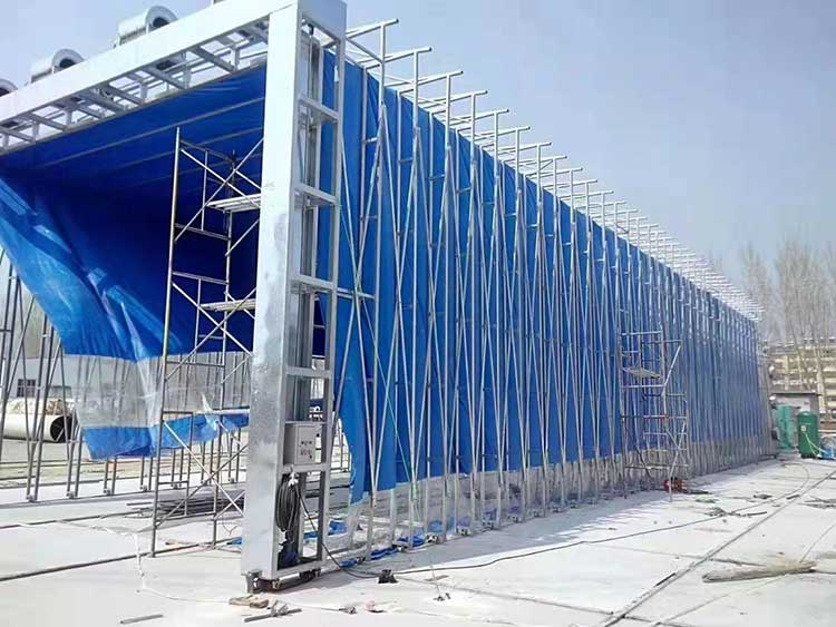 3、伸縮移動噴漆房整體為框架傳動結(jié)構(gòu),每組框架間均有阻燃PVC布密封連接,安裝快捷、外形美觀,結(jié)構(gòu)精巧,使用方便,制造成本低,節(jié)約投資;