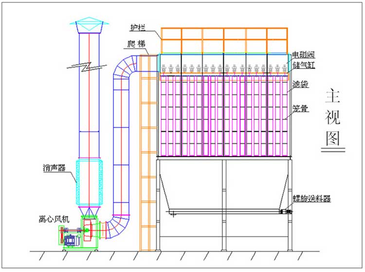 布袋除塵器主要由灰斗、過濾室、凈氣室、支架、提升閥、噴吹清灰裝置等部分組成。工作時,含塵氣體由風(fēng)道進入灰斗。大顆粒的粉塵直接落入灰斗底部,較小的粉塵隨氣流轉(zhuǎn)折向上進入過濾室,并被阻留在濾袋外表面,凈化了的煙氣進入袋內(nèi),并經(jīng)袋口和凈氣室進入出風(fēng)倒,由排風(fēng)口排出。隨著過濾的不斷進行,濾袋外表面的粉塵不斷增加,設(shè)備阻力隨之上升。當設(shè)備阻力上升到一定值時,應(yīng)進行清灰操作,清除濾袋表面的積灰。
