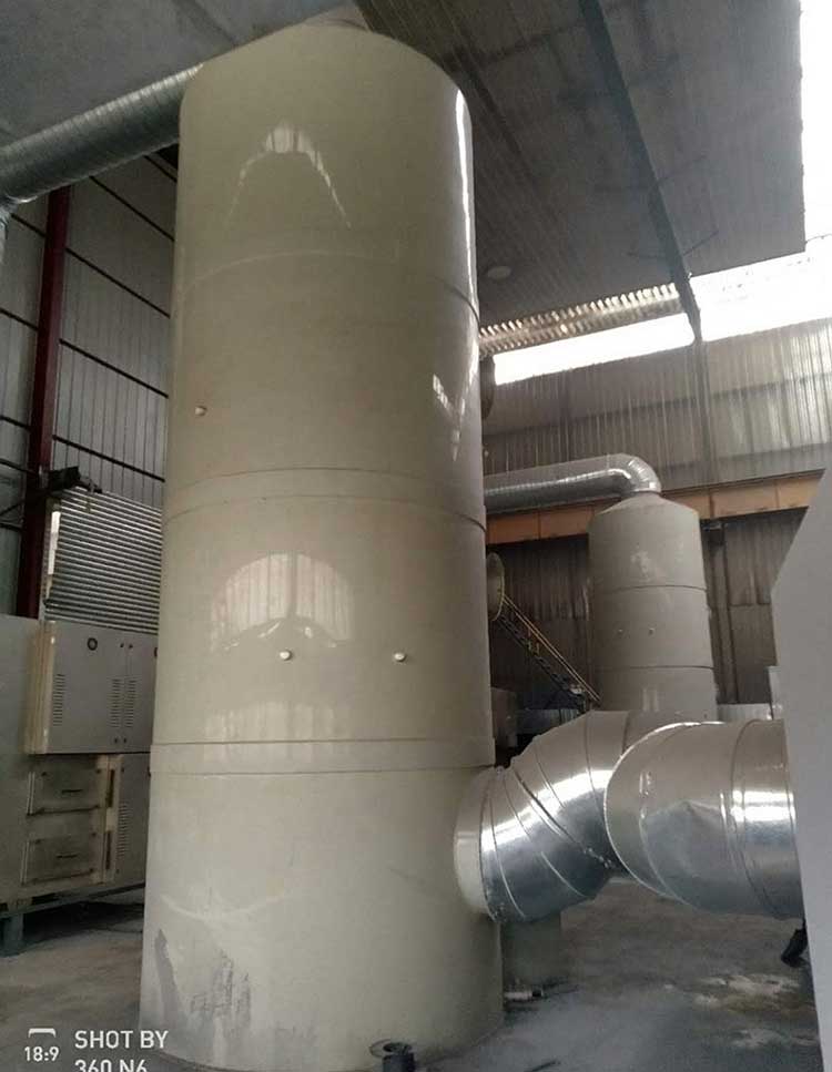 1.1、噴淋塔分單塔和雙塔兩種。使用環(huán)形塔體,采用蘭分段連接制成。主要包括儲液箱、塔體、進風段、噴淋層、填料層、旋流除霧層、觀察窗、出風口等部分。本酸霧凈化塔為環(huán)形塔體,由聚丙烯、PVC等材料通過法蘭連接分段制成。其具體結(jié)構(gòu)由進氣段、填料層、二級噴淋段、旋流板、出氣口、管路等部分組成。PP酸霧凈化塔效果好,抗腐蝕能力強,強度高,噪音低,省電省力,拆裝維護方便。