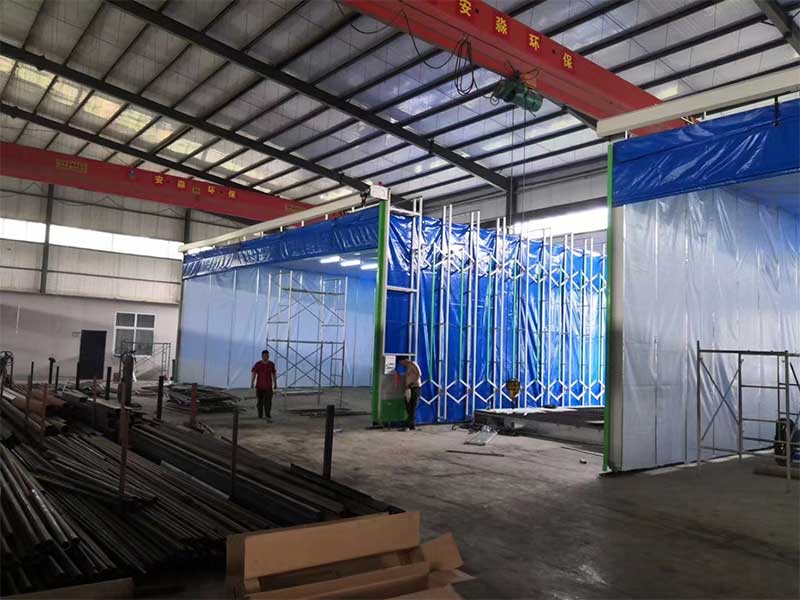 二、伸縮房前部為伸縮龍門架結(jié)構(gòu),兩端的龍門架立柱下部為驅(qū)動小車,左右各一套,分別安裝了驅(qū)動裝置,帶動主動輪拖動龍門架在軌道上做伸展或收縮運動。龍門架的動力通過伸縮連桿傳遞給后面的從動伸縮架,帶動從動伸縮架的從動輪在軌道上跟隨龍門架做伸展或收縮運動。移動伸縮房的出現(xiàn)解決了較大型工件進行噴漆或打磨工作移動運送困難的難題,噴漆或磨研區(qū)可根據(jù)產(chǎn)量大小,任意調(diào)整,充分利用生產(chǎn)場地和操作空間。帶軌道的移動伸縮房前端目前大都使得電動卷簾門,固定端大多配備廢氣處理環(huán)保設(shè)備,今天佑泰環(huán)根據(jù)移動伸縮房應(yīng)用的場景不同,為您介紹一下伸縮房相關(guān)廢氣處理裝置。